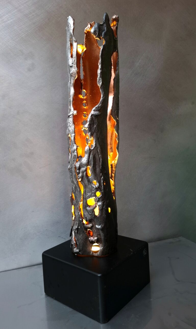 Ausführung: Aufwändige Handarbeit, eigenes Schmelz und Gießverfahren der Leuchte, Sockel ist ebenfalls handgemacht aus Stahl -schwarz matt lackiert.